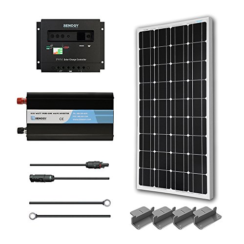 Via: RENOGY® Solar Panel Complete Kit 100W Mono: 1 100Watts Monocrystalline Solar Panel UL Listed+1 30A PWM Charge Controller+1 Off Grid Battery Inverter 1000W+1 Pair of 20Ft MC4 Solar Adaptor Kit+1 Set of Z Brackets