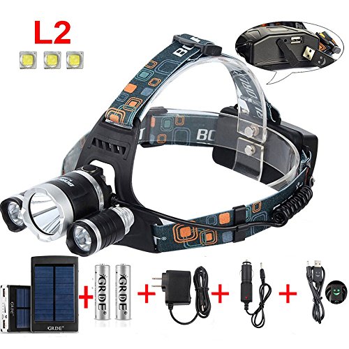 Via: 10000mah Solar Charger and Headlamp; 4 Modes Waterproof Head Lamp for Camping,Jogging,Running(Solar Powerbank+Headlamp +2X18650 Rechargeable Batteries+USB Cable+AC Charger+Car Charger)