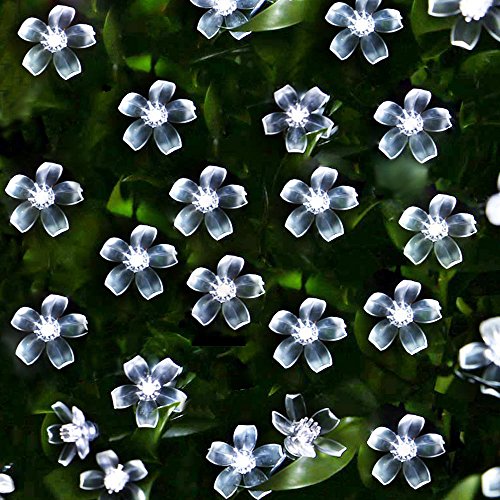 Via: LE® Solar Flower Fairy String Lights 50 LEDs 16.5ft , Waterproof, Daylight White, Portable, Blossom Fairy Christmas Lights with Light Sensor, Outdoor and Indoor Use, Ideal for Wedding, Party, Halloween Lights Decoration