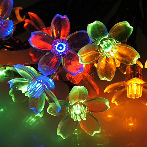 Via: DALMI Solar String Waterproof Lights 15.4ft for Decorating Your Homes, Gardens, Lawn, Porch, Gate, Yard, Patio, Indoor and Outdoor Use (20 LED Multi Color Blossom Lighting)